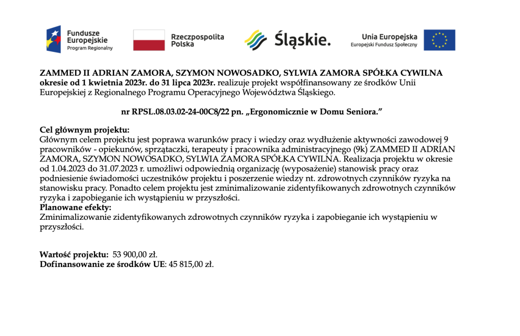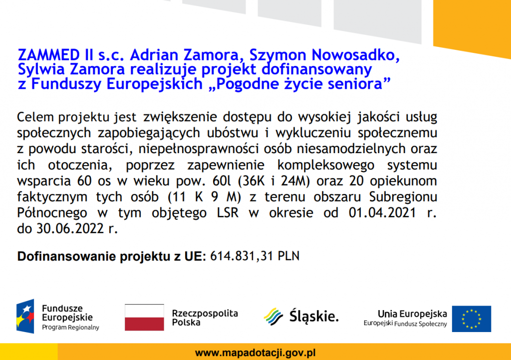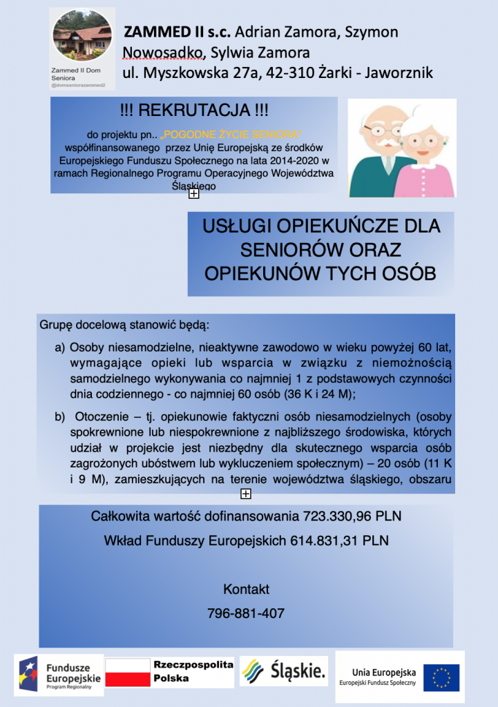 Po zakończeniu projektu „POGODNE ŻYCIE SENIORA”, współfinansowanego przez Unię Europejską ze środków Europejskiego Funduszu Społecznego na lata 2014-2020 w ramach Regionalnego Programu Operacyjnego Województwa Śląskiego, placówka posiada aktualnie 32 miejsca.
